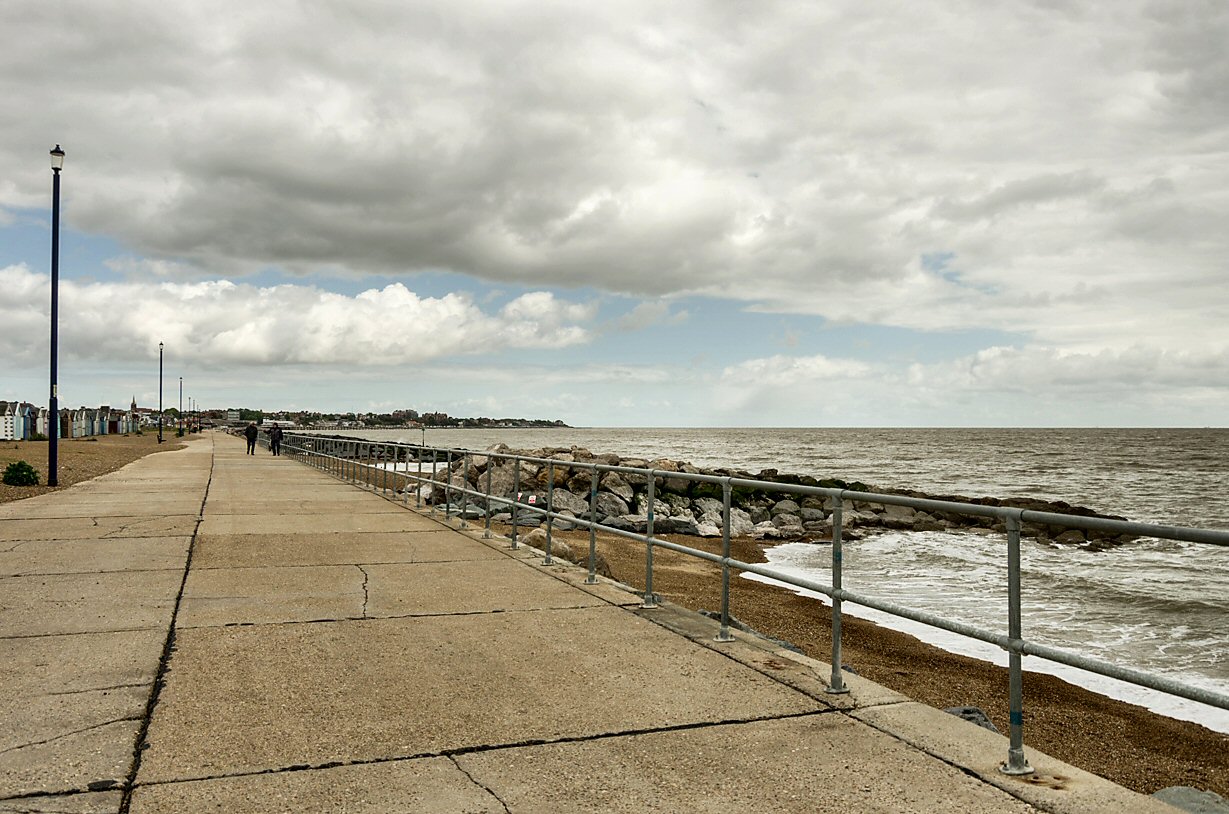 The wind blows clouds in over the pier moments later the sky is clear. I couldn't resist the 3 pigeons, I liked the one that refused to conform. 50p to see the sea, or just look for free. Children play whilst adults seek shelter from the wind. Behind the beach huts a wildflower strip looks colourful.